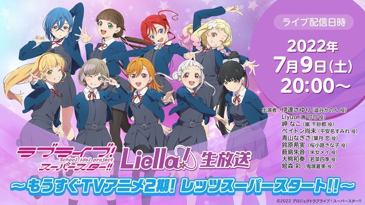 Anime Love Live! Superstar!! yang menampilkan unit idol Liella! sebagaimana telah diberitakan sebelumnya, akan berlanjut ke musim kedua pada bulan Juli 2022 mendatang. Jam tayang musim kedua ini telah dipastikan adalah pukul 19.00 waktu setempat, di saluran televisi NHK-E, dan tayang setiap hari Minggu. Musim kedua ini telah dipastikan akan dirilis di Jepang pada tanggal 17 Juli 2022 mendatang. Grup Liella! sendiri akan semakin disemarakkan dengan hadirnya 4 anggota baru yang akan bergabung bersama.