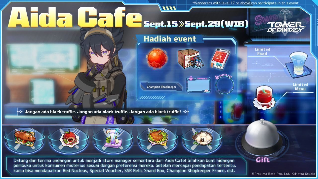 Event Aida Cafe berlangsung mulai 15-29 September 2022. Tunggu apalagi Wanderer? Update aplikasi game Tower of Fantasy-mu ke Versi 1.5, mainkan event Aida Cafe, dan kumpulkan seluruh hadiah gratisnya!