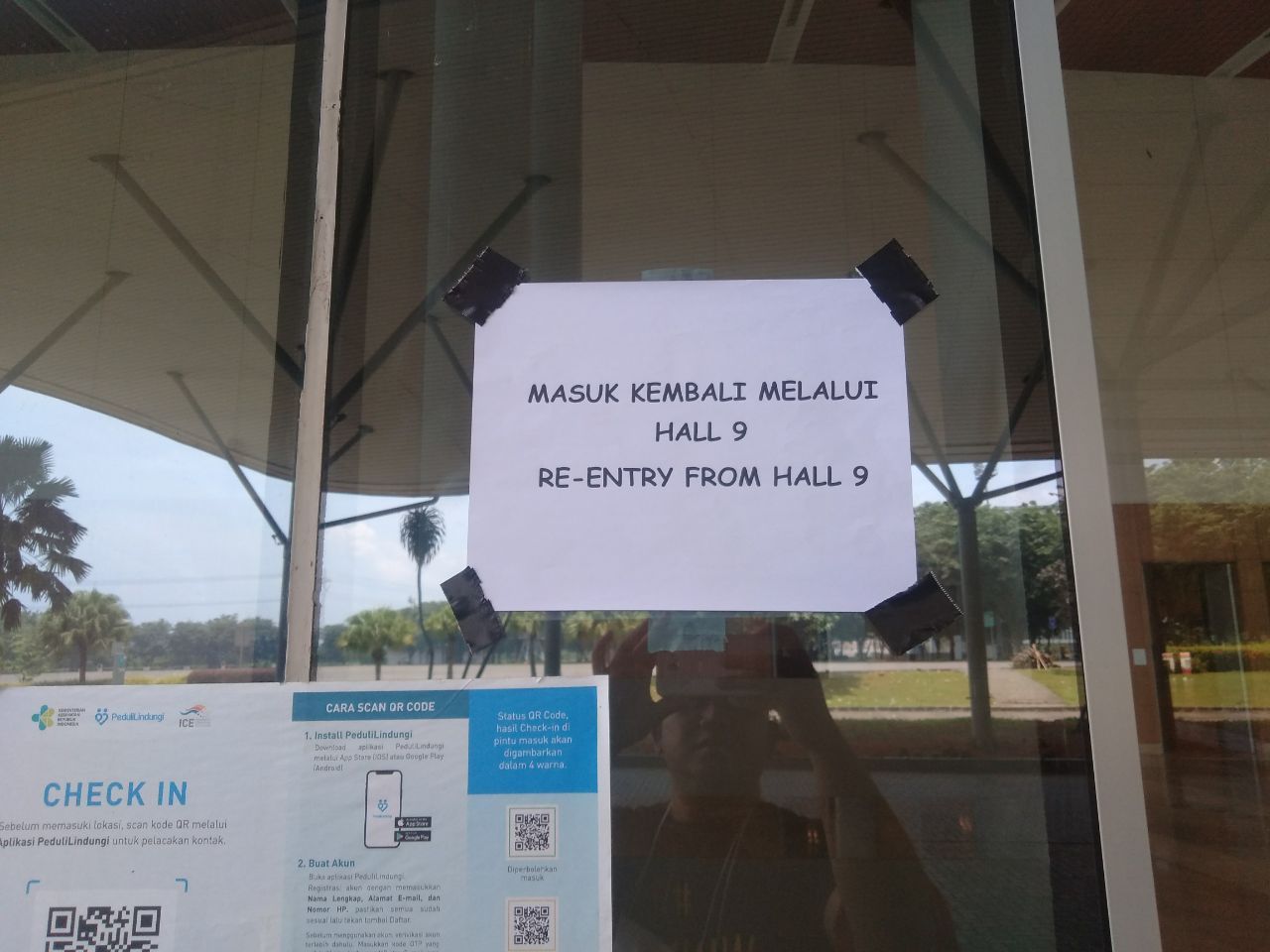 Kemudian tim KAORI mencoba menyusuri hall 10 lebih dekat lagi. Sayangnya karena hall sudah dikunci, tentu saja tidak mungkin masuk ke dalam hall yang pernah dimeriahkan dengan acara Comifuro 15 ini, baik itu serunya atraksi yang dipersembahkan, maupun betapa peluhnya mengantri berjam-jam demi bisa memasuki acara. Namun tim KAORI sempat melongok ke dalam hall yang kini sudah sepi kosong melompong, dan sempat mengabadikan sejumlah selebaran-selebaran yang ditempel di kaca depan, baik mengenai informasi ATM hingga lokasi Musholla.