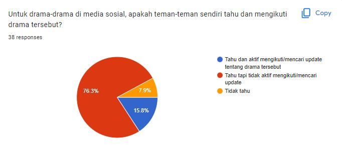 Ketika kami tanyai apakah mereka tahu dan mengikuti drama di media sosial, mayoritas dari mereka ternyata mengetahui drama-drama medsos yang terjadi. 29 orang (76,3%) menjawab tahu tapi tidak mengikuti. 6 orang (15,8 %) menjawab tahu dan aktif mengikuti atau mencari update. Hanya 3 orang (7,9%) yang menjawab tidak tahu.