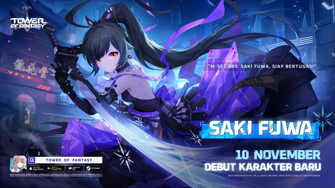 Saki akan diluncurkan di game Tower of Fantasy setelah Ruby. Nantikan kemunculan Saki Fuwa yang akan menemani para Wanderer mengeksplor Vera di Tower of Fantasy, 10 November 2022!