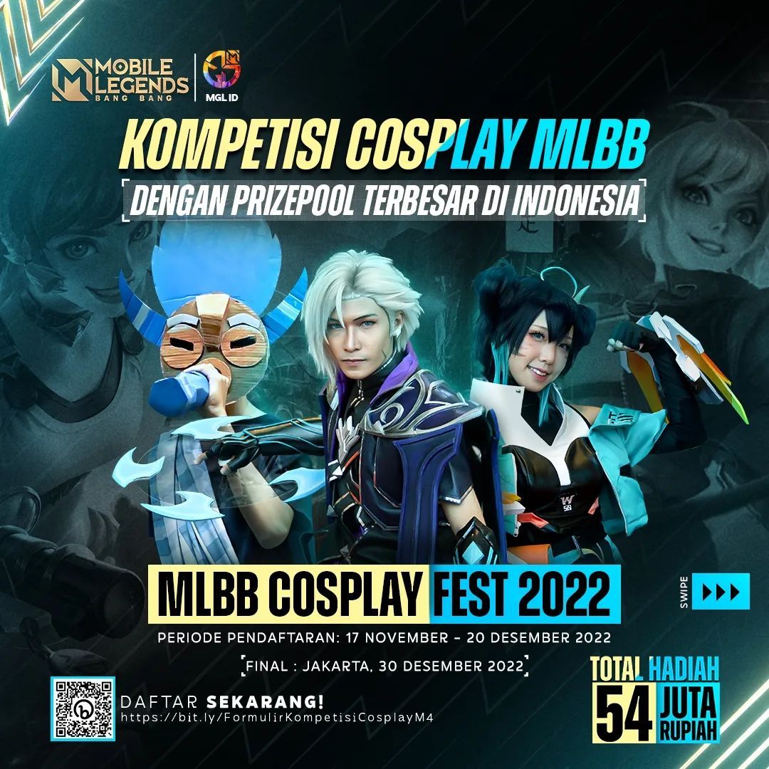 Mulai sekarang hingga 30 Desember 2022, ikuti kompetisi cosplay terbesar yang pernah ada dan menangkan hingga Rp54.000.000 dan 77.000 diamonds. Ekspresikan diri dan tampil sebagai Hero MLBB, MPL Pro Player, Lord, Map, atau bahkan Bush! Peserta wajib upload video publik ke TikTok atau Instagram Reels dan menyertakan tagar berikut: