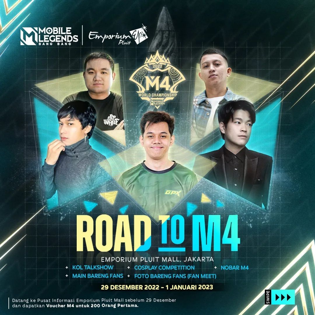 Hitung mundur ke pertandingan pertama M4 World Championship bersama MOONTON Games di Emporium Pluit Mall dimana penggemar dapat berpartisipasi dalam aktivasi offline bersama para talent seperti Oura, Donkey, Wann, XINNN, dan Jonathan Liandi! Road to M4 diadakan mulai 29 Desember 2022 hingga 1 Januari 2023, akan ada talkshow, nonton bareng, fun match bersama fans, dan sesi meet and greet dengan berbagai talent.