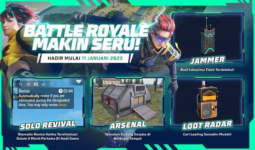 - Gudang Senjata (Arsenal), Solo Revival, dan Item Baru di Mode Battle Royale: Mode Battle Royale akan bertambah seru dengan adanya gudang senjata atau Arsenal yang berisi item dari airdrop hingga senjata level 3. Sebanyak 5-6 Arsenal akan tersebar di setiap map dan hanya bisa dibuka dengan kunci khusus yang bisa didapatkan lewat random loot, atau dibeli melalui vending machine. Selain itu, pemain juga akan mendapatkan item baru berupa Loot Radar yang mendeteksi loot secara otomatis dan Jammer yang berfungsi menghilangkan jejak pergerakan pemain oleh tim lawan.