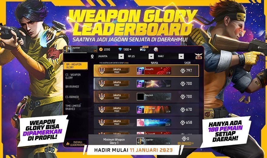 - Weapon Glory Leaderboard : Sistem leaderboard yang mengajak Survivors untuk menjadi yang terbaik dalam menggunakan berbagai Weapons di Free Fire. Pemain yang masuk Top 100 dalam setiap Weapons akan mendapatkan Title khusus untuk menunjukkan peringkat mereka di skala Regional (Provinsi) dan Nasional. Mode Clash Squad dan Battle Royale akan memiliki leaderboard terpisah.