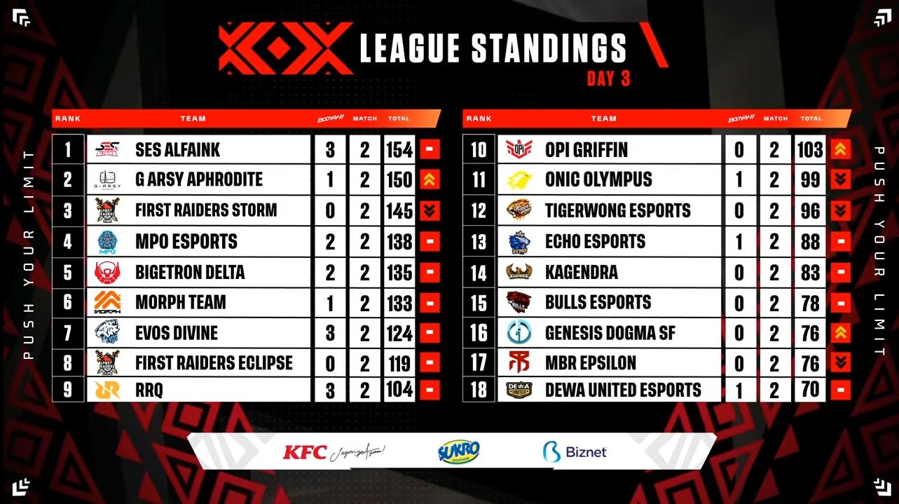 Dengan ini klasemen sementara di week 1 FFML Season 7 masih tetap diraih oleh SES Alfaink dengan total point sebanyak 154 point. Akan tetapi, sang jawara Asia Tenggara jangan bersenang diri dahulu, pasalnya tim G-Arsy Aphrodite asuhan Coach Fayad dengan satu Booyah! bisa mencapai posisi kedua hanya selisih 4 point dari SES Alfaink. Selain G-Arsy Aphrodite, ada First Raiders Storm yang mempunyai point tipis dari G-Arsy sebanyak 5 point dan MPO Esports yang memiliki selisih 6 point dari First Raiders Storm.