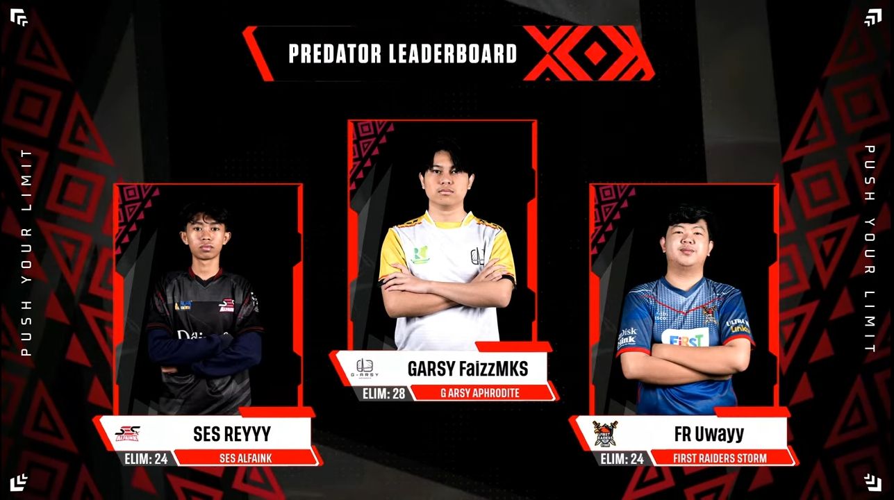 Di klasemen “Predator” alias top kill FFML Season 7, SES REYYY yang sebelumnya berada di puncak predator pada 2 matchday sebelumnya harus turun tahta karena GARSY FaizzMKS berhasil menduduki posisi puncak Predator week 1 dengan total eliminasi sebanyak 28 kill.