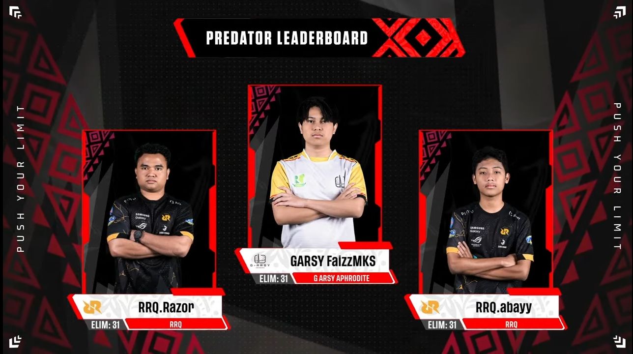 Untuk Top Predator di week 2 match 1 kali ini masih diraih oleh seorang GARSY FaizzMKS dengan total eliminasi sebanyak 31 kill. Akan tetapi, kedua player dari RRQ yaitu Razor dan Abayy akan siap-siap menjatuhkan posisi seorang FaizzMKS dengan perolehan total eliminasi yang sama, yaitu 31 kill.