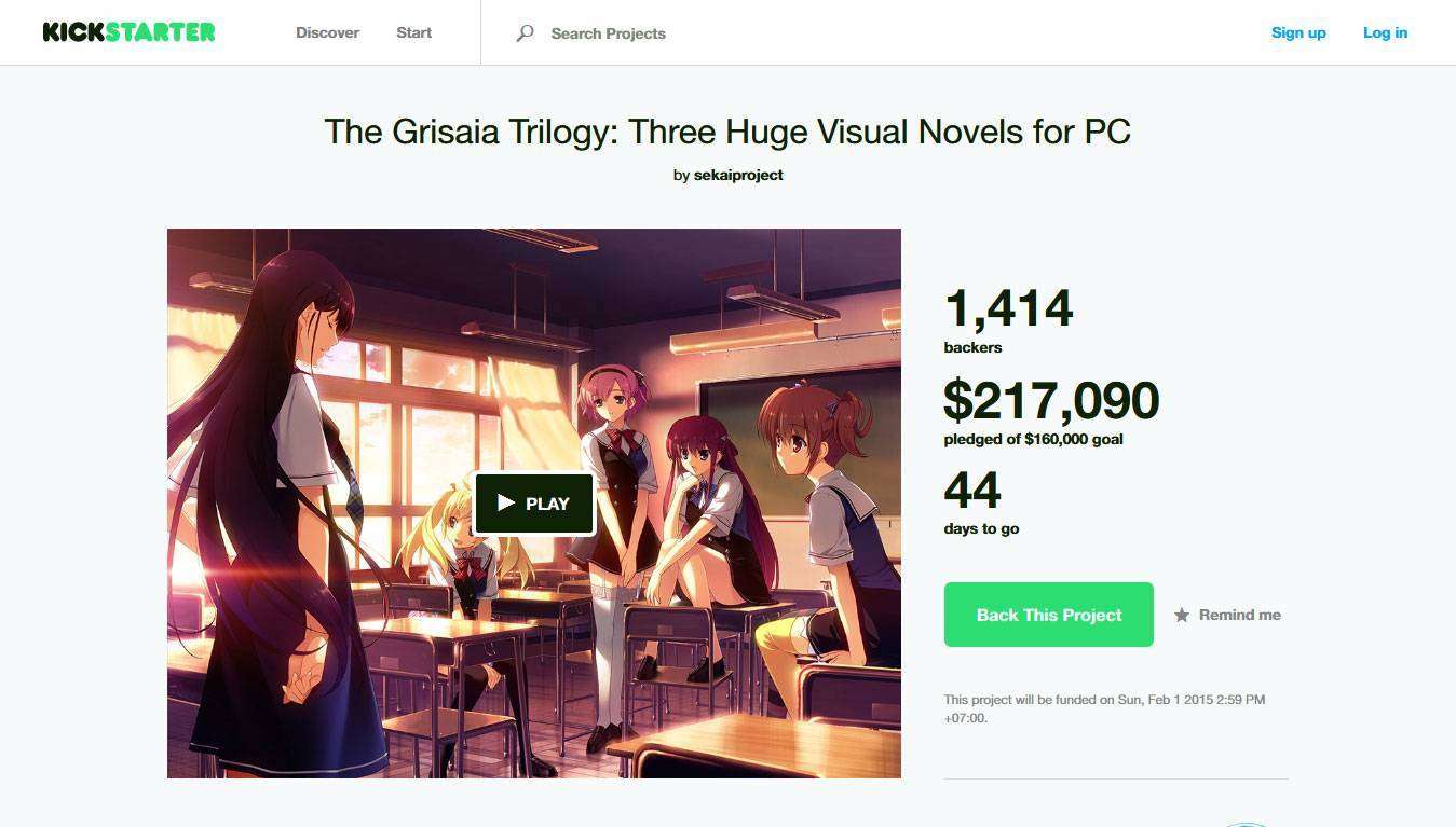 Penggalangan dana untuk lokalisasi trilogi novel visual Grisaia no Kajitsu telah dimulai, dengan target awal adalah 160 ribu dolar Amerika (setara 2 miliar rupiah) dan dibuka sampai 1 Februari 2015. Sementara itu, sampai berita ini diturunkan, target telah terlampaui dengan dana sebesar 217 ribu dolar Amerika.