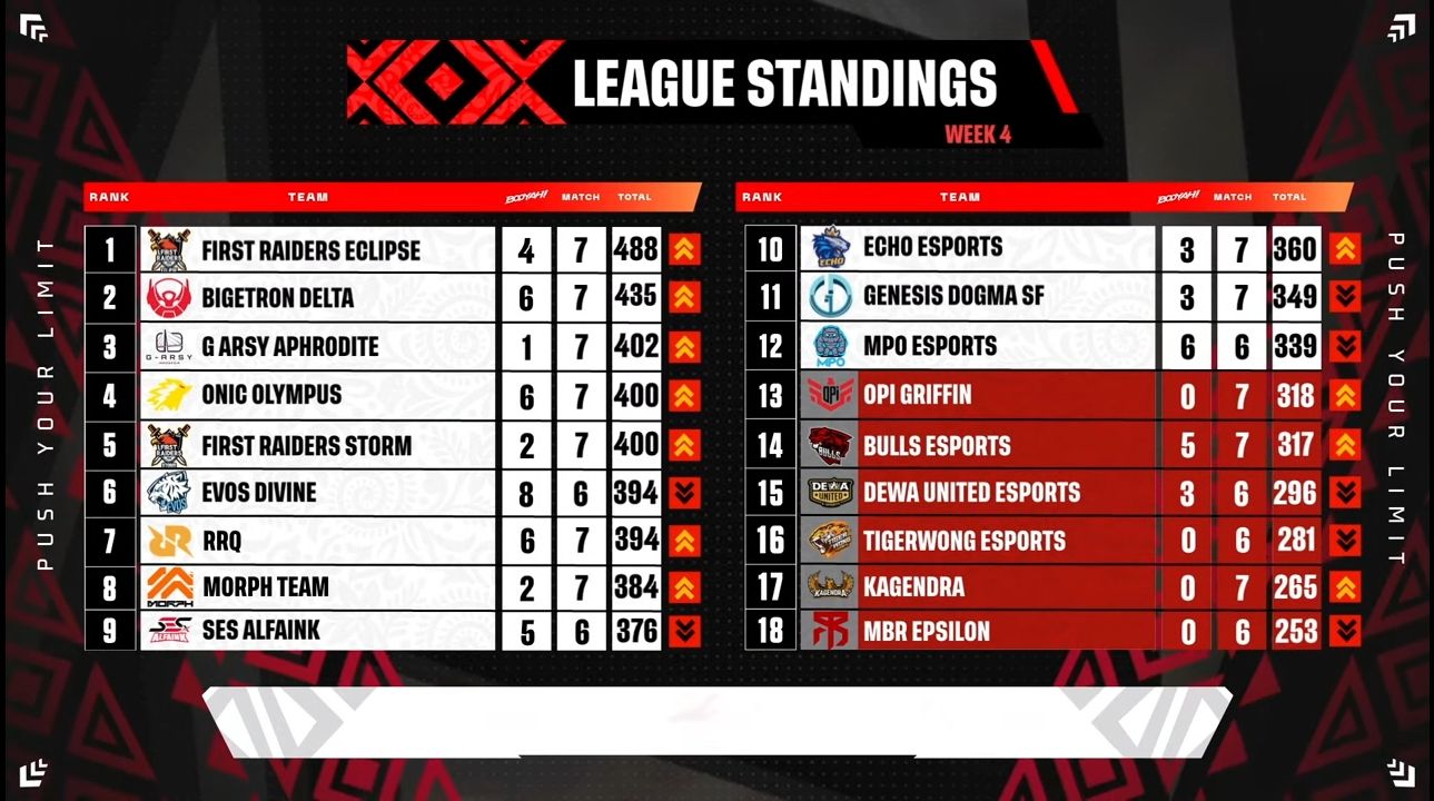 Untuk perolehan klasemen sementara di match FFML Season 7 kali ini, seluruh squad First Raiders Eclipse merayakan keberhasilannya berada di posisi puncak dengan perolehan total point sebanyak 488 point, kemudian disusul oleh Bigetron Delta di posisi kedua dengan total 435 point. G-Arsy Aphrodite yang walaupun melakukan blunder di ronde terakhir tapi pada akhirnya berada di posisi ketiga sekaligus dihantui oleh ONIC Olympus dan First Raiders Storm yang berada di posisi keempat dan kelima dengan selisih 2 point dari G-Arsy.
