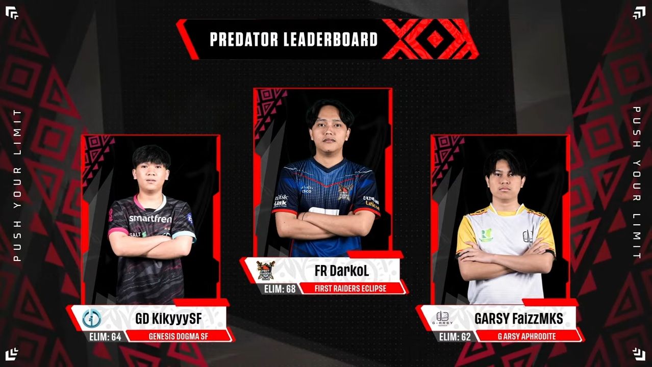 Top Predator pada match FFML Season 7 kali ini berhasil dibuat oleh seorang FR Darkol dari First Raiders Eclipse yang berada di posisi puncak dengan perolehan eliminasi sebanyak 68 kill. Untuk di posisi kedua kali ini diraih oleh GD KikyyySF dengan total eliminasi sebanyak 64 kill. Posisi ketiga menjadi angin segar untuk comeback-nya seorang GARSY FaizzMKS yang membuat tim G-Arsy Aphrodite menjadi lebih baik dengan total eliminasi sebanyak 62 kill, selisih 2 point dari seorang KikyyySF.