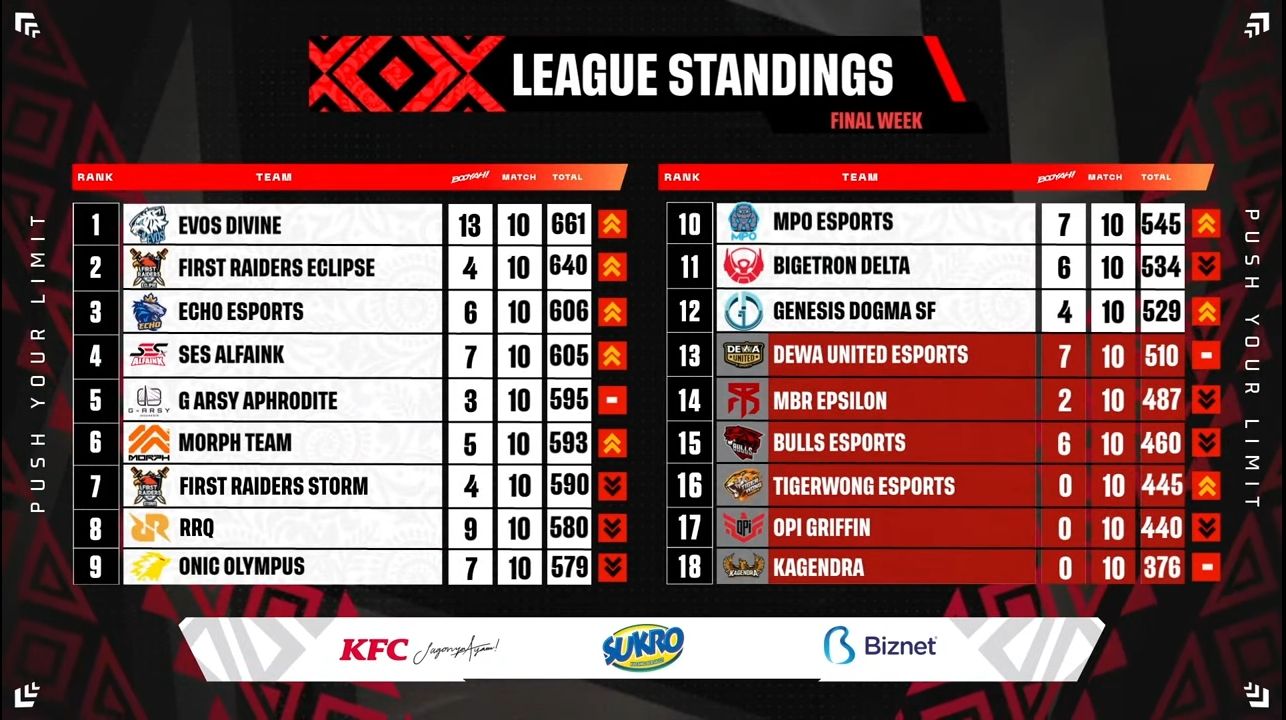 Bagaimana dengan nasib sang jawara Asia Tenggara, SES Alfaink? Kali ini mereka harus berpuas diri di posisi keempat dengan jarak total point terpaut tipis satu angka dari Echo Esports. Sementara G-Arsy Aphrodite asuhan Coach Fayad harus geleng-geleng karena tidak bisa mendapatkan mahar dari Coach Manay karena squad mereka berada di posisi kelima dengan perolehan point sebanyak 595 point.