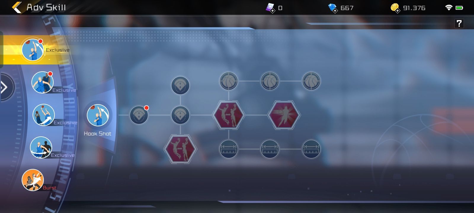 Setiap karakter mempunyai Adv. Skill masing-masing yang bisa di-upgrade melalui upgrade skill card yang bisa didapatkan melalui misi maupun bermain. Setiap skill bisa di-upgrade agar karakter yang dimiliki bisa memiliki hasil maksimal jika digunakan pada saat pertandingan dan bisa dilihat hasilnya dari yang pemain upgrade sendiri. Pemain juga bisa upgrade stats karakter yang dimiliki dengan melakukan training sesuai kebutuhan pemain.