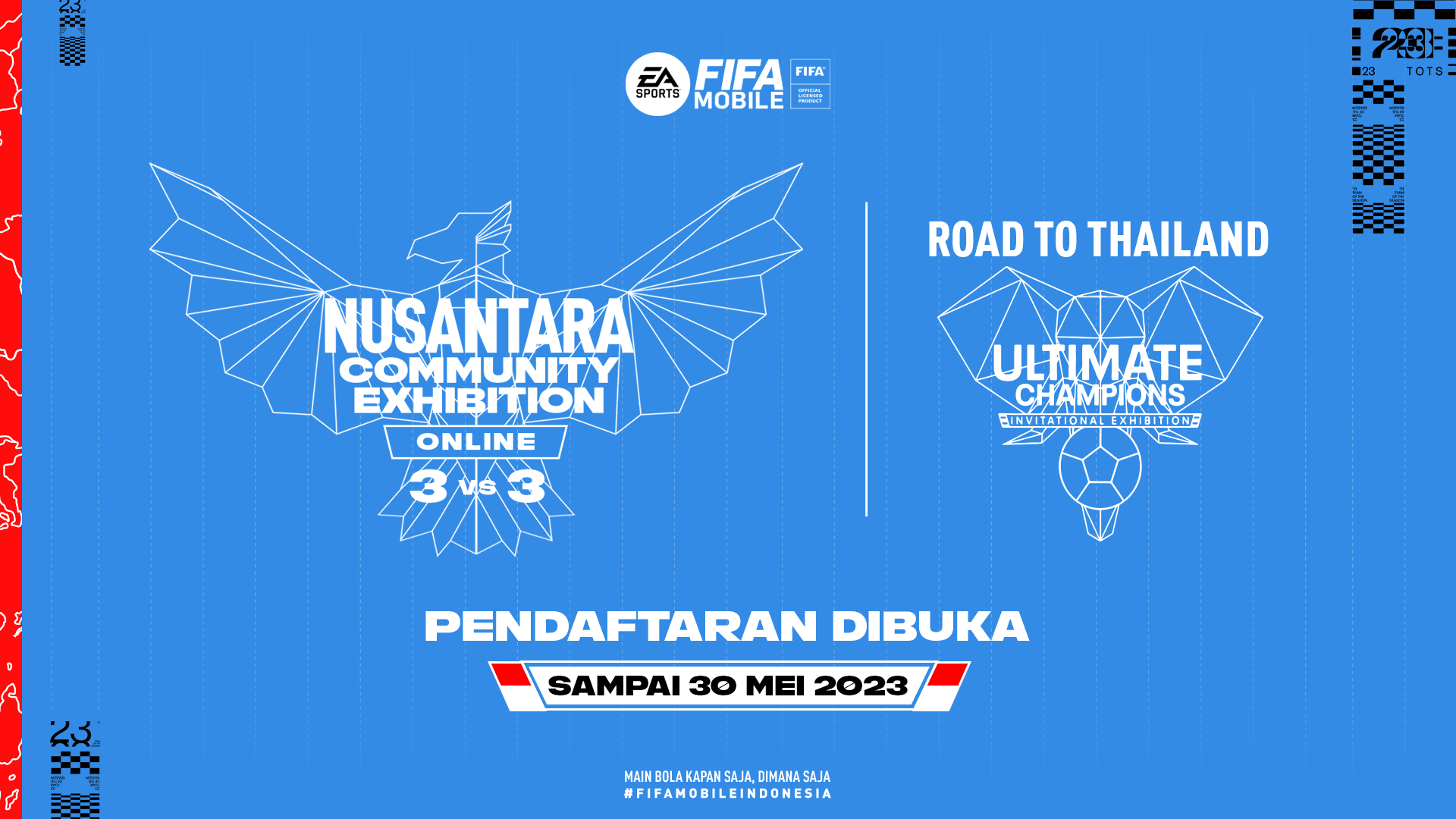 Dalam rangka memeriahkan event tahunan Team of the Season (TOTS) di 2023 ini, FIFA Mobile Indonesia dengan bangga mengumumkan Nusantara Community Exhibition yang bertujuan untuk menemukan tim terbaik yang mewakili Indonesia pada sebuah event komunitas yang akan diadakan di Thailand pada tanggal 17-18 Juni 2023, bertajuk Ultimate Champions Invitational Exhibition Thailand.