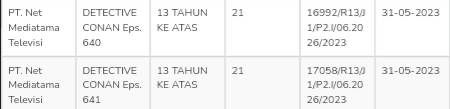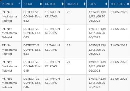 Detektif Conan saat ini tengah ditayangkan secara rutin di stasiun televisi NET. Anime ini saat ini ditayangkan setiap hari Sabtu dan Minggu, pada pukul 06.30 WIB. Kini teungkap bahwa NET tengah berencana untuk kembali menambah jumlah episode terbaru untuk ditayangkan. Berdasarkan data melalui Lembaga Sensor Film (LSF), terungkap NET telah resmi mendaftarkan episode Detektif Conan dari 640-646, atau dalam episode asli Jepangnya adalah episode 589-596 dengan status lulus sensor per-tanggal 31 Mei 2023. Episode-episode baru tersebut telah siap untuk ditayangkan oleh NET sewaktu-waktu. NET sebelumnya juga sempat menayangkan 5 judul film layar lebar Conan.