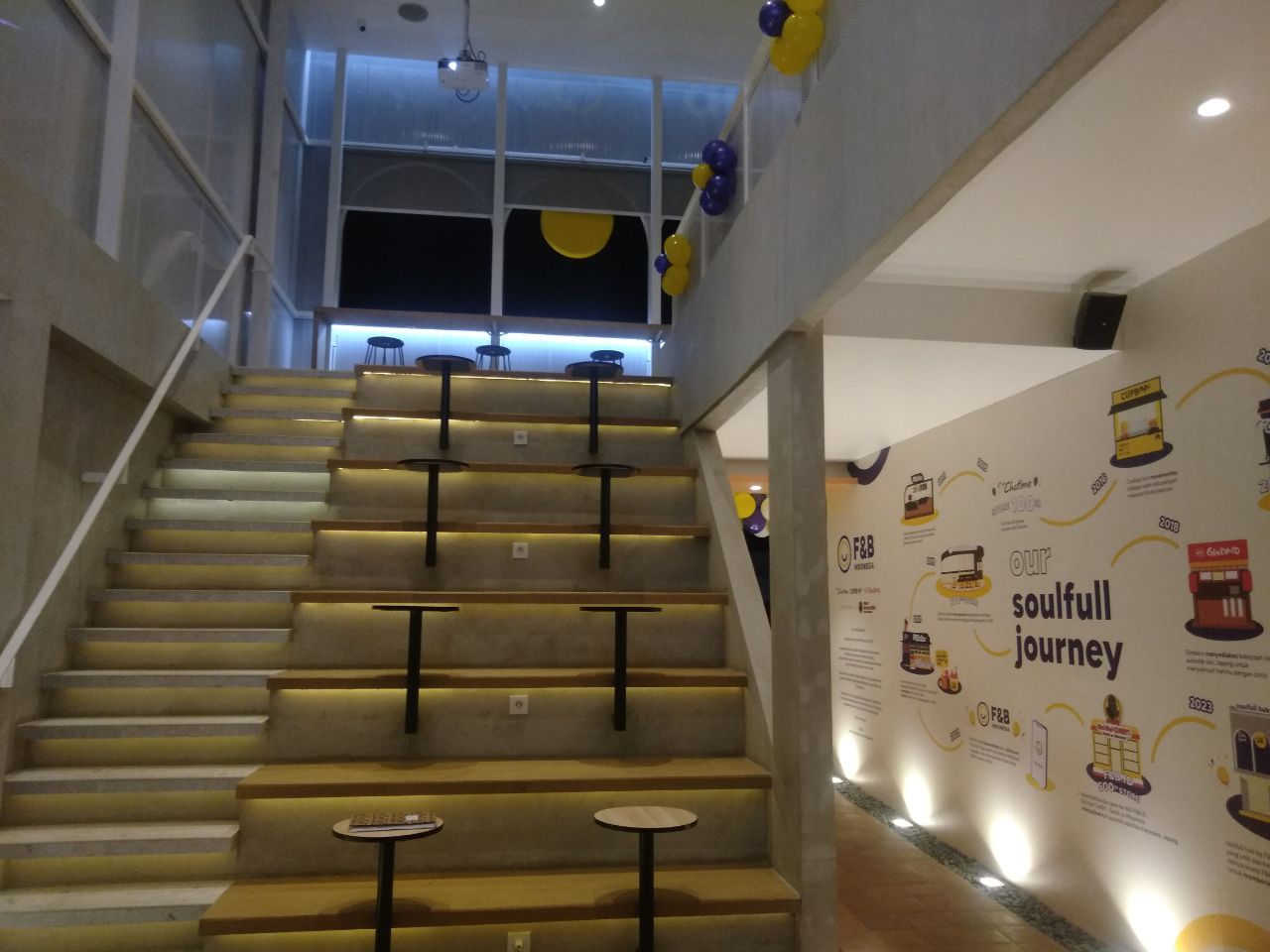 Karenanya pemandangan tangga luar dan tribun duduk ini jika dilihat langsung dari atas akan terasa “ngeri-ngeri sedap” jika anda takut dengan ketinggian. Apalagi tribun duduk untuk nobar ini juga terletak di bagian luar yang berkonsep semi outdoor. Karenanya mungkin tidak akan nyaman bagi yang kurang suka dengan hembusan angin luar.