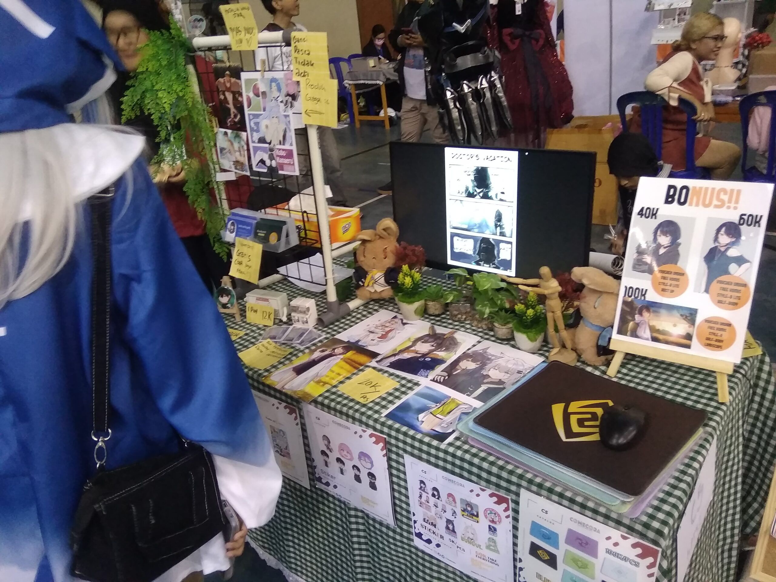 Salah satu penjual yang ada di booth itu bercerita kalau hobi dalam membuat commission art ini sudah mereka tekuni sejak semasa SMA dan baru di akhir-akhir ini mereka bisa membuka commission art lagi setelah melewati masa Covid-19 beberapa tahun yang lalu.