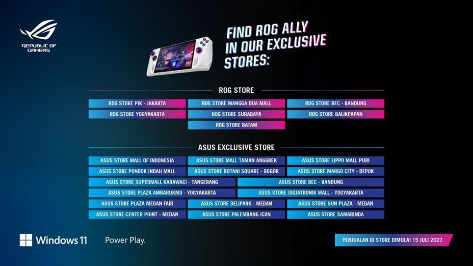 ROG Ally juga akan tersedia secara eksklusif di ROG Store dan ASUS Exclusive Store di seluruh Indonesia. Penjualan eksklusif tersebut akan dimulai pada tanggal 15 Juli 2023 serentak di kota-kota di Indonesia. Gamers yang ingin mendapatkan ROG Ally dapat membeli secara langsung di ROG Store dan ASUS Exclusive Store.