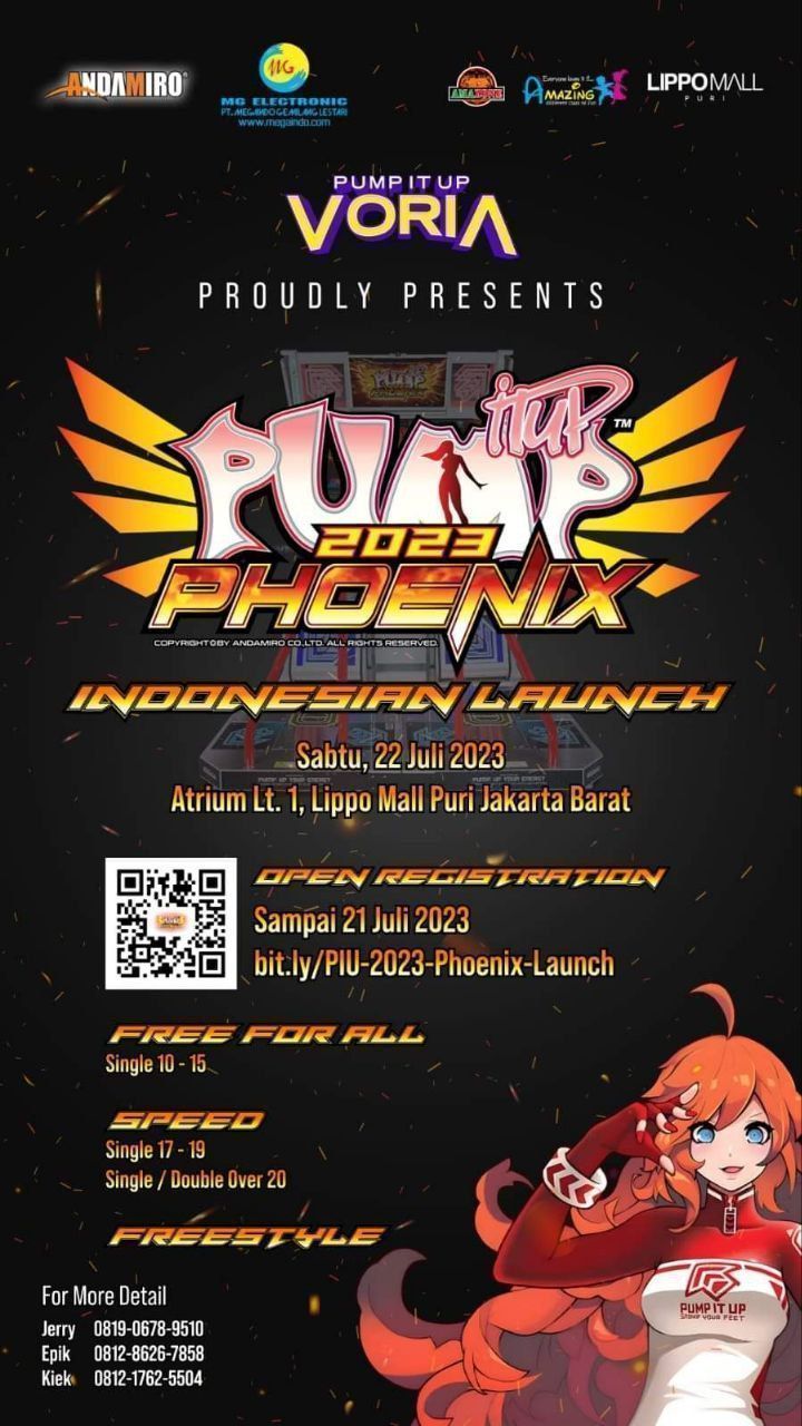 PT Megaindo Gemilang Lestari bekerja sama dengan Andamiro, Lippo Mall Puri, Amazone Amazing, dan Pump it Up Voria telah resmi meluncurkan PIU 2023 Phoenix dalam acara peluncuran yang diadakan di Lippo Mall Puri pada hari Sabtu tanggal 22 Juli 2023 lalu. Tak lupa acara peluncuran ini turut diramaikan dengan lomba yang diikuti para pemain PIU yang antusias menyambut dan mencoba seri PIU terbaru ini. Turut hadir pula Chang “Macnom” Hee Son selaku Project Leader Pump It Up dan Daniel Kim sebagai sales & promotion Andamiro, juga dihadiri oleh perwakilan dari pusat permainan (Amazone) dan komunitas Pump It Up Indonesia. Setidaknya ada sebanyak 100 tamu hadir pada acara ini dan berkumpul di Atrium Lippo Mall Puri, Jakarta Barat.