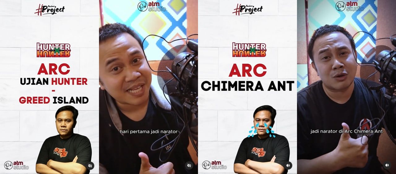 Setelah tayang sejak bulan Mei lalu, kini penayangan Hunter X Hunter 2011 ini akhirnya telah mencapai lakon Chimera Ant. Puluhan episode sudah anime ini tayang secara rutin di Youtube Muse Indonesia. Puluhan episode sudah para seiyu mendubbing episode-episodenya ke dalam bahasa Indonesia. Tidak terkecuali dengan Byas Maulana Diputra yang menjadi seiyu Ilmi dan Chrollo, sekaligus narator dari anime ini, yang menarasikan kisah di animenya, di setiap episodenya. Tapi bagaimana sih momen perjalanan Byas Maulana Diputra dalam menarasikan anime ini di tiap-tiap episodenya, hingga kini mencapai lakon Chimera Ant? Mari intip video dari akun Instagram resmi ATM Studio ini: