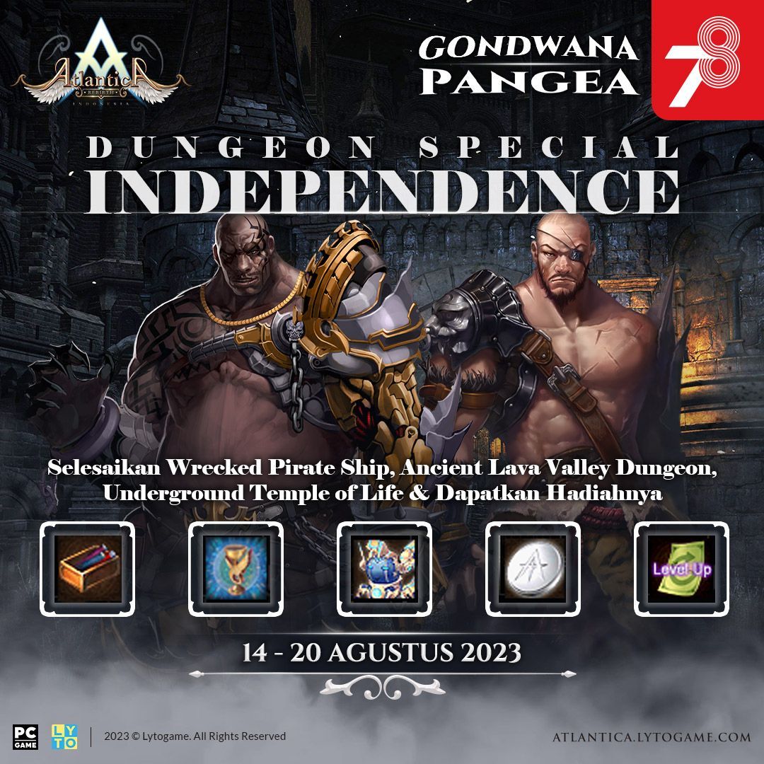 Meriahkan HUT ke-78 Republik Indonesia, tim Atlantica Rebirth Indonesia menantang para Atlantian untuk menyelesaikan semua dungeon yang telah ditentukan lewat event dengan tajuk Dungeon Special Independence. Atlantian yang berhasil menyelesaikan serangkaian dungeon akan mendapatkan hadiah tanpa diundi, berikut detail-nya: