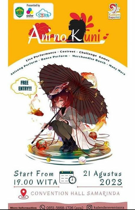 Event cosplay SORA di Kaltim Expo 2023 akan diadakan pada 21 Agustus 2023, dan dimulai pada pukul 19.00 WITA sampai selesai. Judul acara cosplay ini akan berjudul Ani no Kuni, yang selain akan mengadakan acara cosplay event ini juga akan mengadakan acara menarik lainnya seperti talent live performance, challenge games, anisong performance, dance perfomance dan masih banyak lagi.