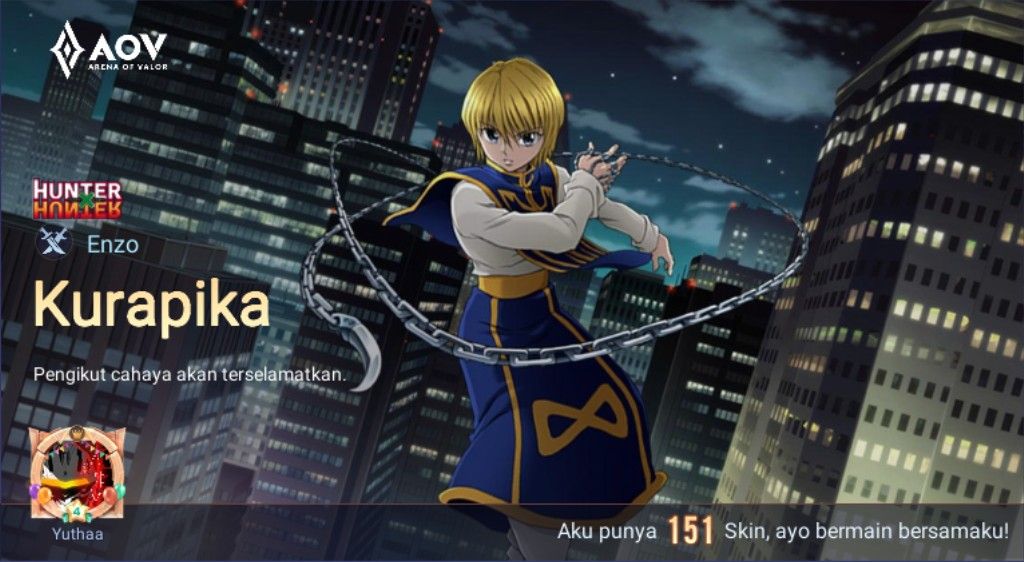 Ulasan: Kali ini Enzo mendapatkan skin Kurapika, di mana kurapika itu sendiri pengguna Nen Conjuration & Specialization. Namun kali ini yang akan dibahas hanya Conjuration. Conjuration itu melibatkan pembuatan objek material fisik, independent dari aura seseorang. Namun pengguna kategori ini juga dapat membuat hukum dan prinsip dan juga membubuhkan ke area tertentu atau bahkan membuat dimensi saku mereka sendiri. Mereka menguasai materialisasi objek tertentu, mereka dapat menyihir dan menghilakannya dalam sekejap kapapun mereka mau. Enzo adalah hero pengguna kekuatan alat suci yang akan dilemparkan alat tersebut kepada musuhnya. Alat suci tersebut berbentuk seperti celurit yang mempunyai semacam besi yang bisa ditarik ulur sesuai kemauan Enzo. Efek dari Kurapika sebagai pengguna rantai yang tiap rantainya berbeda-beda di setiap jarinya sesuai dengan hero Enzo yang juga mempunyai alat suci yang bisa dilempar ke musuhnya. Apalagi efek rantai tersebut benar-benar ada efek nen-nya. Semua skill efek dari skin Kurapika sangat bagus. Akan tetapi sangat disayangkan ketika skill Judgemetnnya ketika bergerak atau ingin menyerang musuh tidak mengeluarkan rantai, kalau dikeluarkan mungkin akan bagus. Untuk skill crusadenya sangat menarik untuk kalian yang suka melihat Kurapika menggunakan rantai. Judgementnya yang Ketika musuh terikat dan lalu dibanting juga sangat menarik untuk dilihatkan.