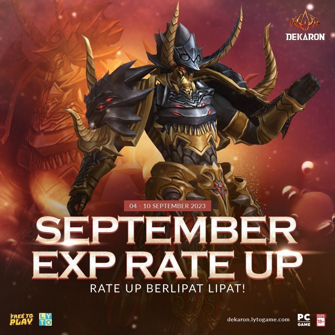 - Peningkatan Tingkat Pengalaman September (4-10 September 2023) dalam event Peningkatan Tingkat Pengalaman September, para pemain Dekaron dapat memperoleh bonus pengalaman (EXP) sebesar 3 kali lipat. Event ini merupakan kesempatan yang tepat bagi para pemain untuk meningkatkan level karakter kesayangan mereka selama periode event berlangsung.