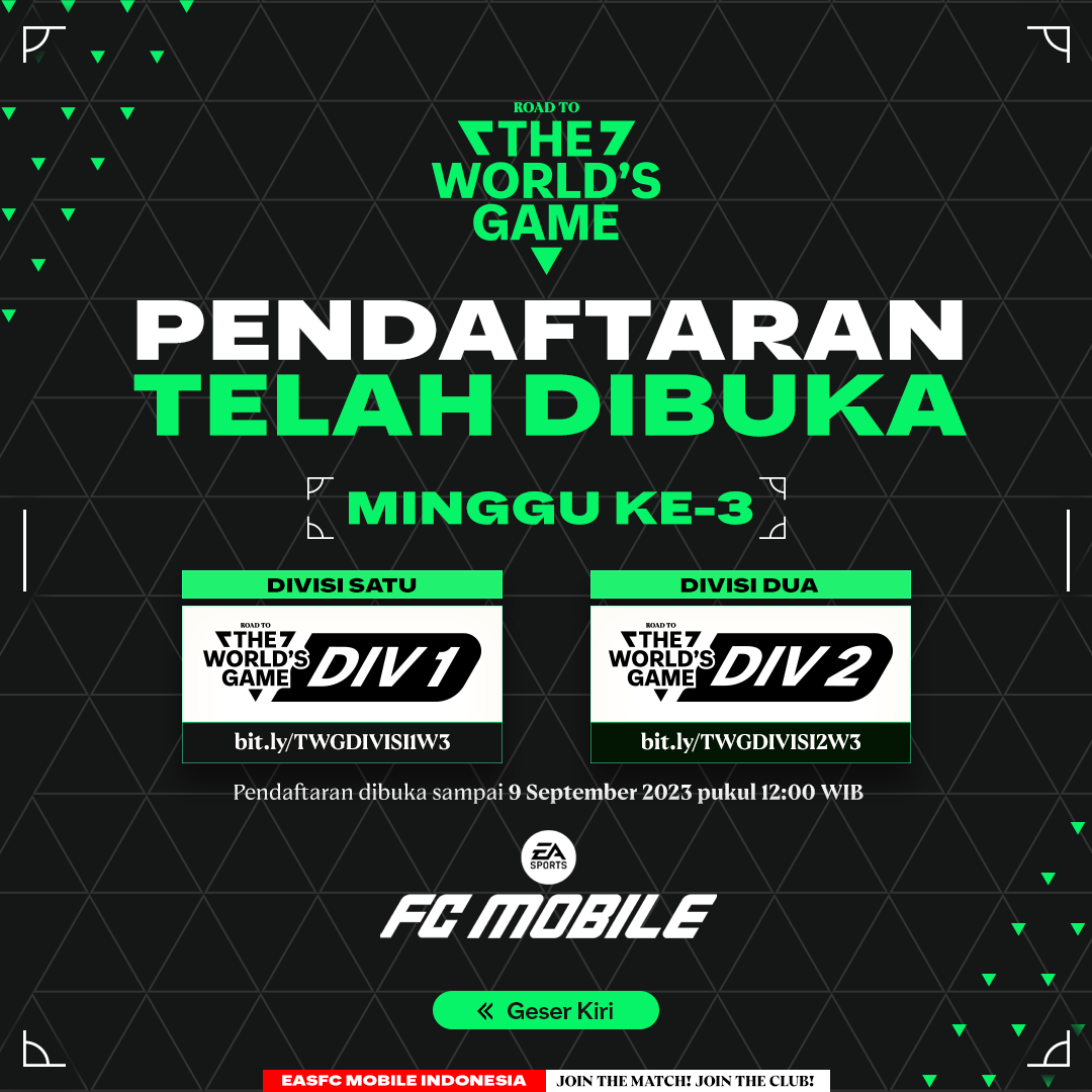 Ayo daftar untuk Minggu 3, Untuk The World’s Game Divisi 1 bisa kunjungi bit.ly/TWGDIVISI1W3 dan untuk The World’s Game Divisi 2 bisa kunjungi bit.ly/TWGDIVISI2W3.