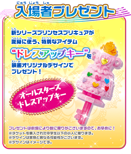 Penonton yang memesan tiket terlebih dahulu pada tanggal 27 Desember akan mendapatkan bonus paket ikat rambut beserta tas berwarna merah muda atau biru, dengan gambar karakter Precure. Para anak-anak (maksimal usia SMP) yang menonton film tersebut dapat mendapatkan mainan ‘Dress Up Key’ versi All Stars sebagai bonus. ‘Dress Up Key’ sendiri merupakan item transformasi di Go! Princess Precure.