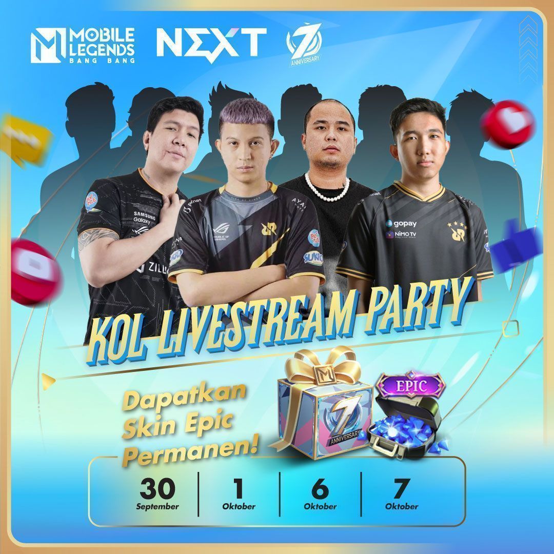 Dalam rangka menyambut event yang hadir di in game Mobile Legends: Bang-Bang, para KOL dari game ini akan meramaikan dengan melakukan live streaming. Nantinya, Lemon, Windah Basudara, Skylar, Xinn, Markocop, Dwiiwoi, Pascol, Marsha, Antimage, dan Leokoce akan menghibur kita dalam livestream party tersebut.