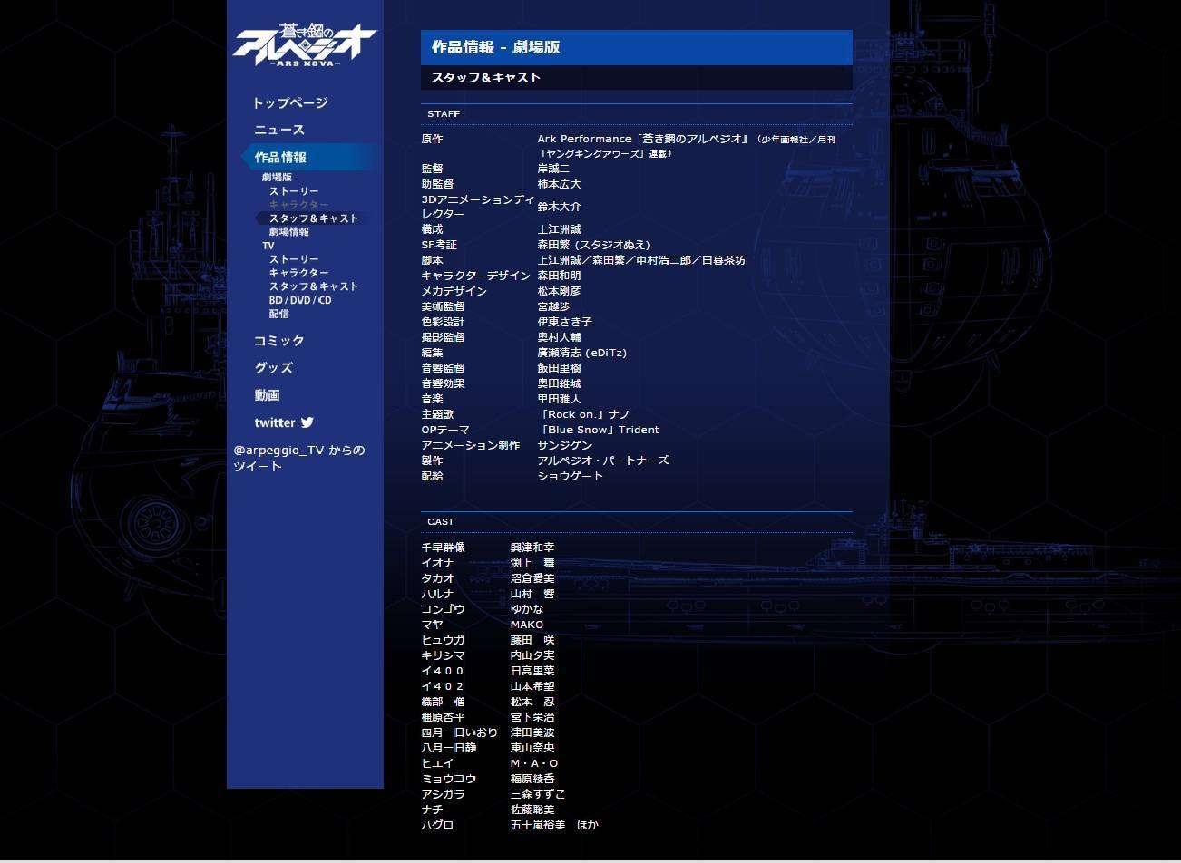 Laman resmi dari seri Aoki Hagane no Arpeggio: Ars Nova pada hari minggu menampilkan beberapa pengisi suara baru untuk mengisi karakter-karakter baru di filmnya. Setelah sebelumnya M.A.O dikonfirmasi mengisi karakter Battleship Hiei, maka kali ini yang diumumkan adalah pengisi suara dari karakter Myouko-class.