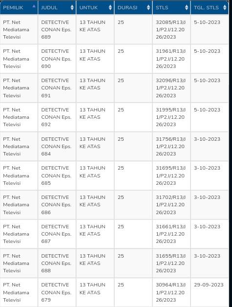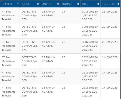 Detektif Conan saat ini tengah ditayangkan secara rutin di stasiun televisi NET. Anime ini saat ini ditayangkan setiap hari Sabtu dan Minggu, pada pukul 06.30 WIB. Sebelumnya sempat dilaporkan bahwa NET baru saja memiliki sejumlah episode terbaru yang belum pernah ditayangkan, yakni episode 667 hingga 669, atau dalam episode asli Jepangnya adalah episode 616-618. Kini melalui data Lembaga Sensor Film (LSF), terungkap NET telah resmi mendaftarkan episode Detektif Conan dari 667 hingga 692, atau dalam episode asli Jepangnya adalah episode 616-641 dengan status lulus sensor per-tanggal 5 Oktober 2023. Episode-episode baru tersebut telah siap untuk ditayangkan oleh NET sewaktu-waktu. Meskipun begitu, masih belum ada kelanjutan informasi lebih lanjut akan hal ini. NET sebelumnya juga sempat menayangkan 5 judul film layar lebar Conan.