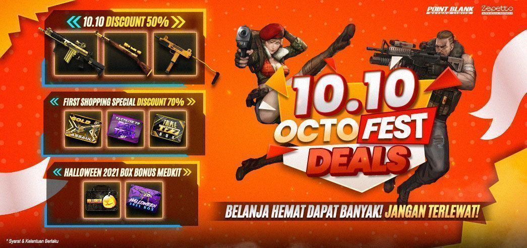 Bertepatan dengan angka kembar di tanggal 10 Oktober ini, OctoFest Deals hadir untuk memberikan penawaran terbaik berupa diskon item sebesar 50%. Kamu bisa mendapatkan item seperti T77 G., Kar98k ZF39 Gold, SC-2010 Gold, dan masih banyak lagi dengan durasi selama 30 hari hanya dengan setengah harga saja. Event ini berlangsung dari 10 Oktober hingga 13 Oktober 2023.