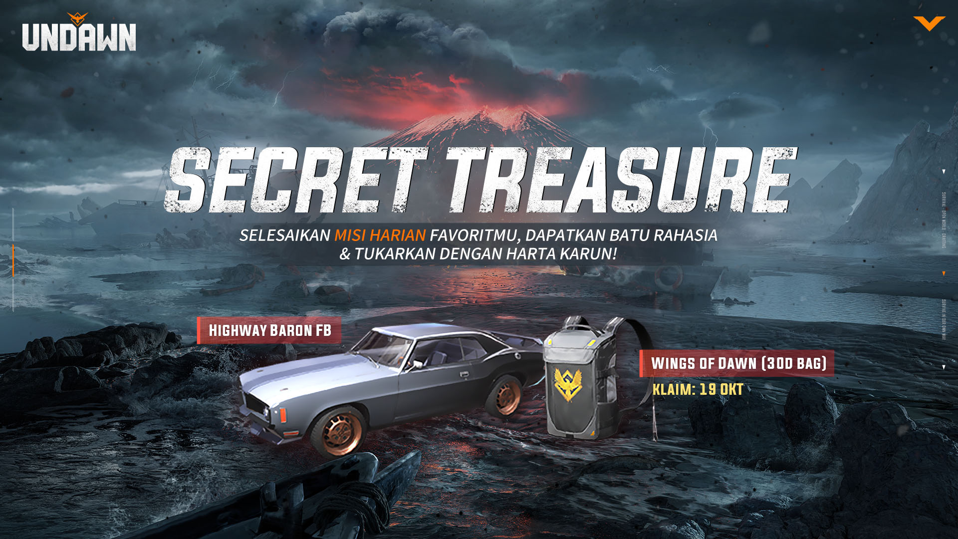 Event Secret Treasure juga akan menjadi event paling ditunggu di path update Island Mystery. Berlangsung pada 16-29 Oktober 2023, para pemain akan diajak mengumpulkan Secret Stones dengan menyelesaikan berbagai misi harian di Undawn. Pemain kemudian dapat menukarkannya untuk berbagai material menarik, termasuk hadiah utama berupa vehicle Highway Baron FB permanen. Khusus di tanggal 19 Oktober, pemain juga bisa mendapatkan Secret Stone untuk backpack Wings of Dawn (30 days).