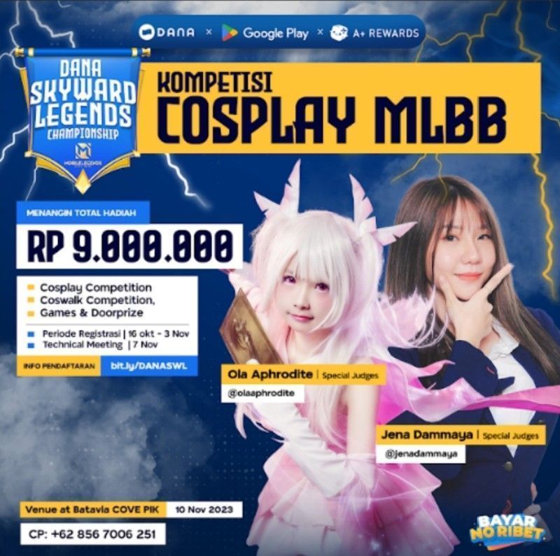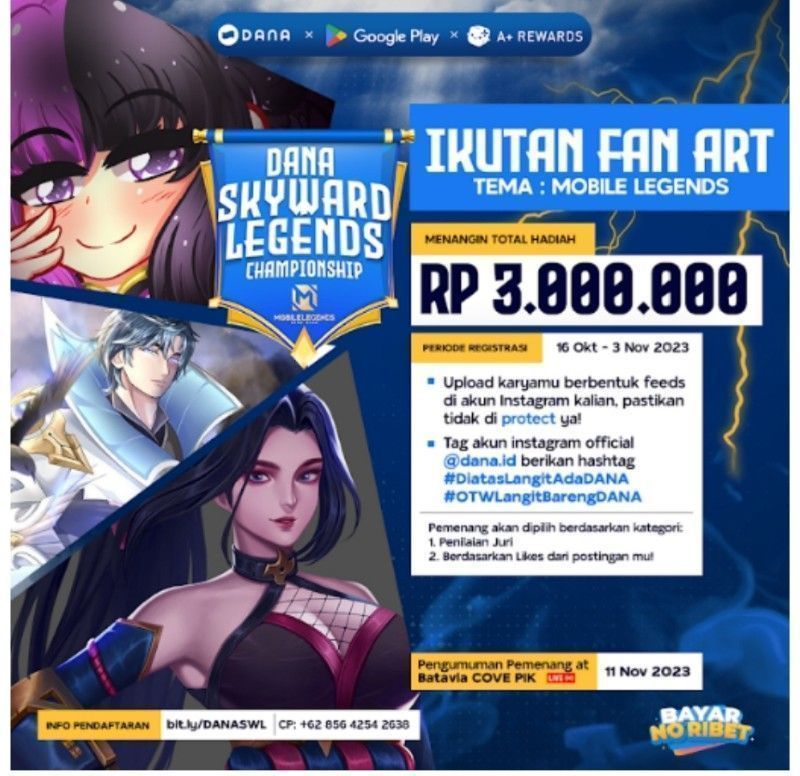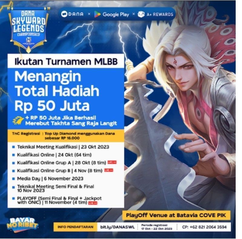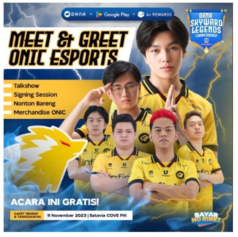 Platform pembayaran digital, DANA berkolaborasi dengan Google Play menghadirkan sebuah turnamen game Mobile Legends: Bang Bang bertajuk DANA Skyward Legends MLBB Championship serta kesempatan melakukan Meet & Greet bersama ONIC Esports pada tanggal 11 November 2023 yang bertempat di Batavia Cove PIK Jakarta.