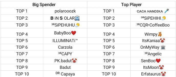 Kategori Big Spender dan Top Player berdasarkan pemenang dari event 3rd Anniversary Carnival yang telah berlangsung pada 19 hingga 28 September 2023 di aplikasi Lita. Event edisi spesial ulang tahun Lita berlangsung sengit, dimana para player berlomba-lomba memperebutkan Top 1 di leaderboard event. Begitu pula di leaderboard Big Spender, para Big Spender memperjuangkan Top Player nya menjadi pemenangnya.