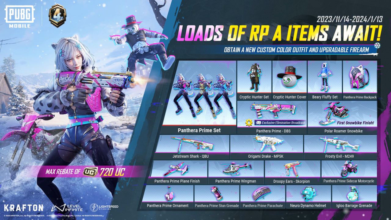 Game PUBG MOBILE meluncurkan Royale Pass Ace 4 (RP A4) pada 14 November 2023 untuk merayakan pembaruan versi 2.9. Di Royale Pass Ace 4 bertajuk Snowfall Supreme yang akan tersedia 14 November 2023 – 13 Januari 2024, terdapat dua upgradable skins hadiah utama yang bisa didapatkan yaitu Panthera Prime Set dan Panthera Prime DBS.