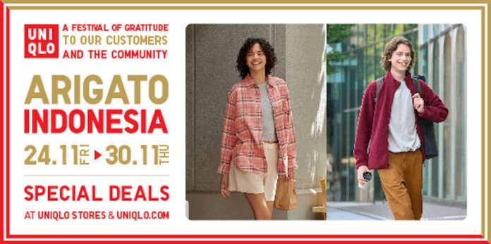 Perusahaan ritel global asal Jepang, UNIQLO kembali mempersembahkan festival promosi ARIGATO INDONESIA sebagai bentuk apresiasi atas dukungan pelanggan setianya yang telah menjadikan koleksi LifeWear sebagai bagian dari gaya hidup sehari-hari. Dalam program ini, pelanggan UNIQLO dapat menikmati berbagai penawaran khusus serta special deals yang hanya berlaku selama periode 24 – 30 November 2023 di seluruh toko UNIQLO di Indonesia dan UNIQLO.com.