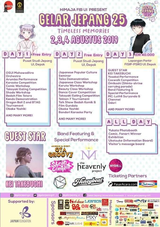 Himpunan Mahasiswa Japanologi FIB UI kembali lagi tahun ini dengan festival budaya Jepang populer, Gelar Jepang Universitas Indonesia (GJUI)! Pada penyelenggaraannya yang ke-25, GJUI memilih Timeless Memories sebagai tema untuk membangkitkan rasa nostalgia terhadap kebudayaan Jepang yang populer sejak tahun 90-an di Indonesia. GJUI 25 akan diadakan pada 2, 3, dan 4 Agustus 2019, di Universitas Indonesia, Depok.