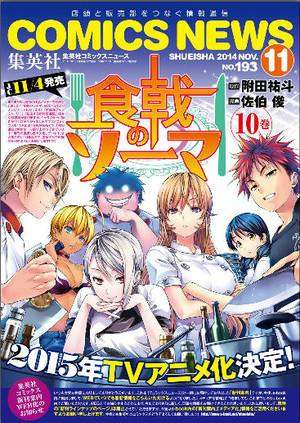 Seri manga bertemakan kuliner, Shokugeki no Soma dikabarkan akan mendapatkan adaptasi seri anime. Manga kuliner yang dibalut komedi besutan Yutou Tsukuda dan Shun Saeki ini direncanakan akan tayang pada tahun 2015 mendatang.
