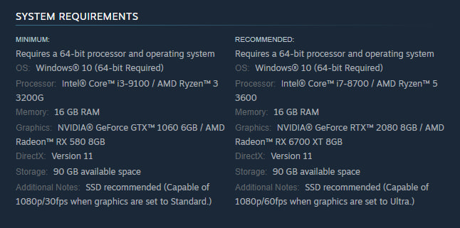 Dalam pembuatan ulasan ini sendiri, saya memainkan game ini dalam versi Steam. Berikut ini adalah spesifikasi minimun dan spesifikasi yang disarankan untuk memainkan game ini: