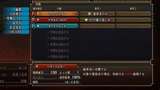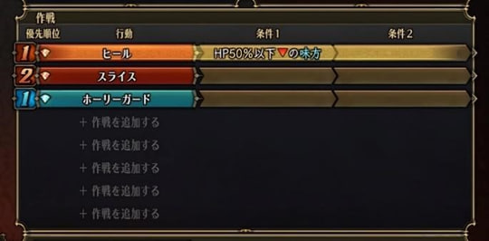 Taktik dapat memiliki prioritas yang berbeda. Karakter akan menggunakan keahlian tertinggi dalam Daftar Prioritas mereka dengan kondisi yang telah terpenuhi, jadi pastikan memberi prioritas pada sihir penyembuhan atau keahlian vital lainnya.