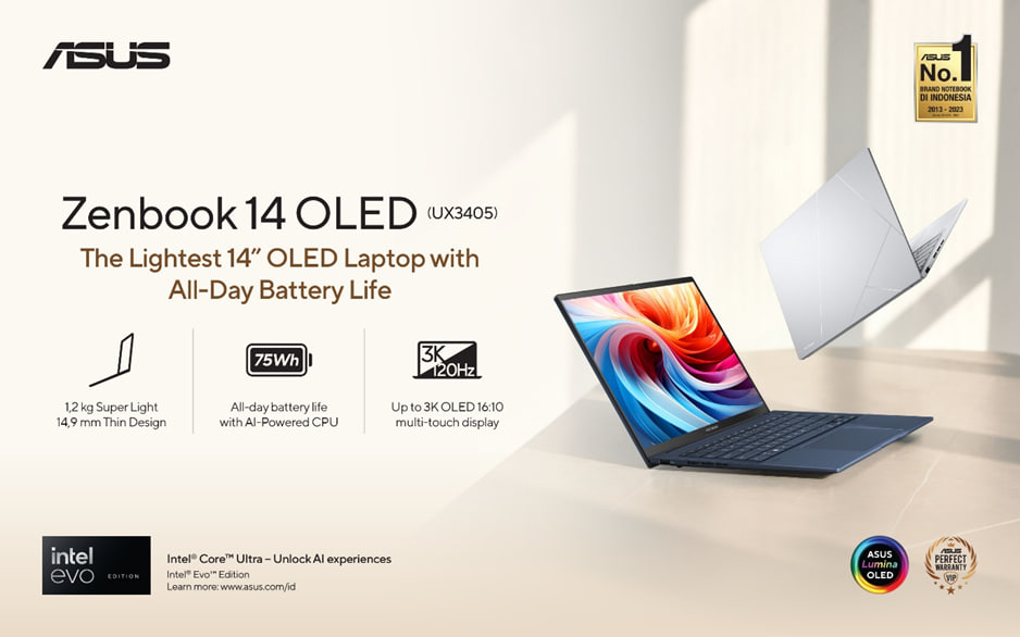ASUS resmi menghadirkan Zenbook 14 OLED (UX3405) sebagai AI powered OLED laptop di Indonesia. Zenbook 14 OLED (UX3405) merupakan laptop tipis pertama dari ASUS yang dibekali prosesor Intel® Core™ Ultra Series, yaitu prosesor generasi terbaru yang telah ditenagai oleh AI dan dapat mengakomodasi pemrosesan aplikasi berbasis AI secara lebih optimal dan hemat daya. Tidak hanya itu, Zenbook 14 OLED (UX3405) juga hadir dengan layar ASUS Lumina OLED beresolusi 3K, memiliki daya tahan baterai seharian, serta mengusung desain premium dan portabel dengan bobot hanya 1,2 kg dan ketebalan 14,9mm.