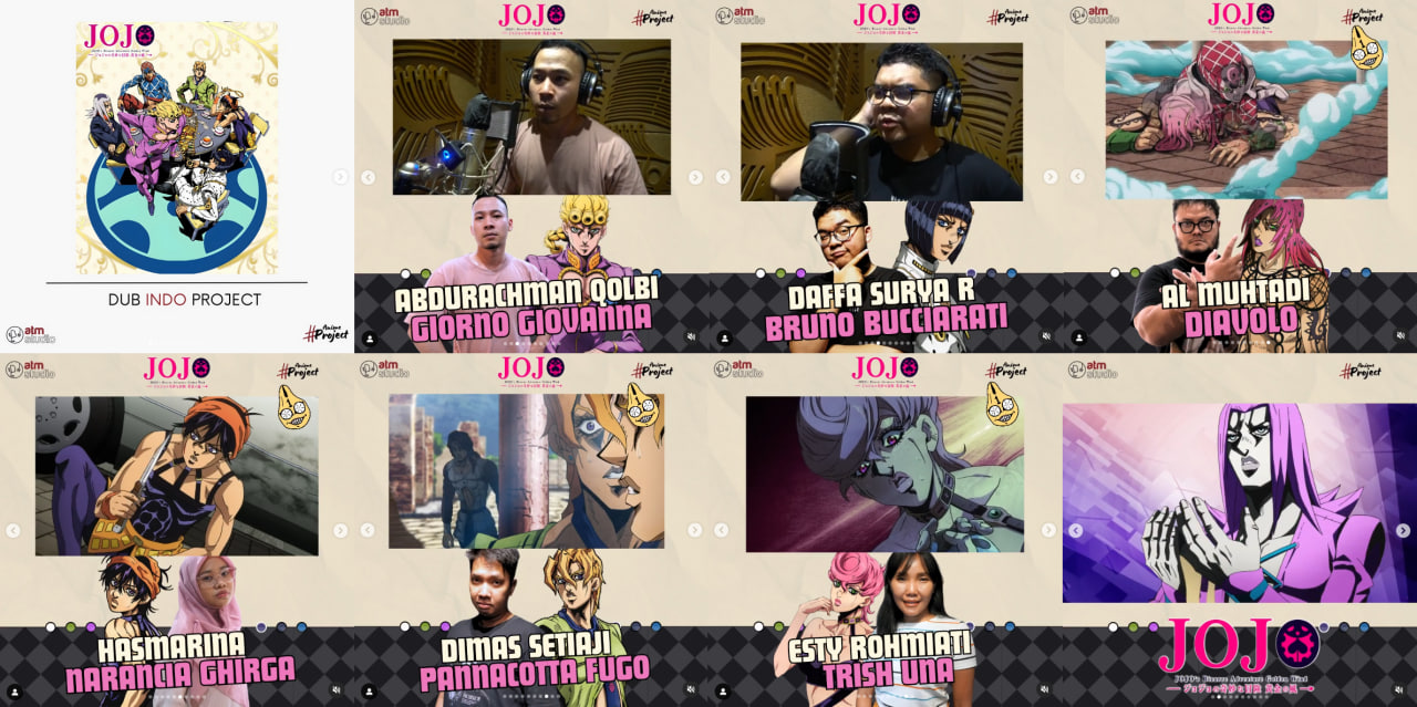 Keempat musim sebelumnya dari anime JoJo’s Bizarre Adventure, yakni Phantom Blood, Battle Tendency, Stardust Crusaders, dan Diamond is Unbreakable telah hadir dalam dubbing berbahasa Indonesia. Dubbing bahasa Indonesia ini digarap oleh ATM Studio yang sudah bisa menggarap dubbing untuk anime-anime dari Muse Indonesia. Kini musim kelima yakni Golden Wind atau Vento Aureo juga sudah tersedia dubbing Indonesianya. Intip sesi dubbingnya berikut ini: