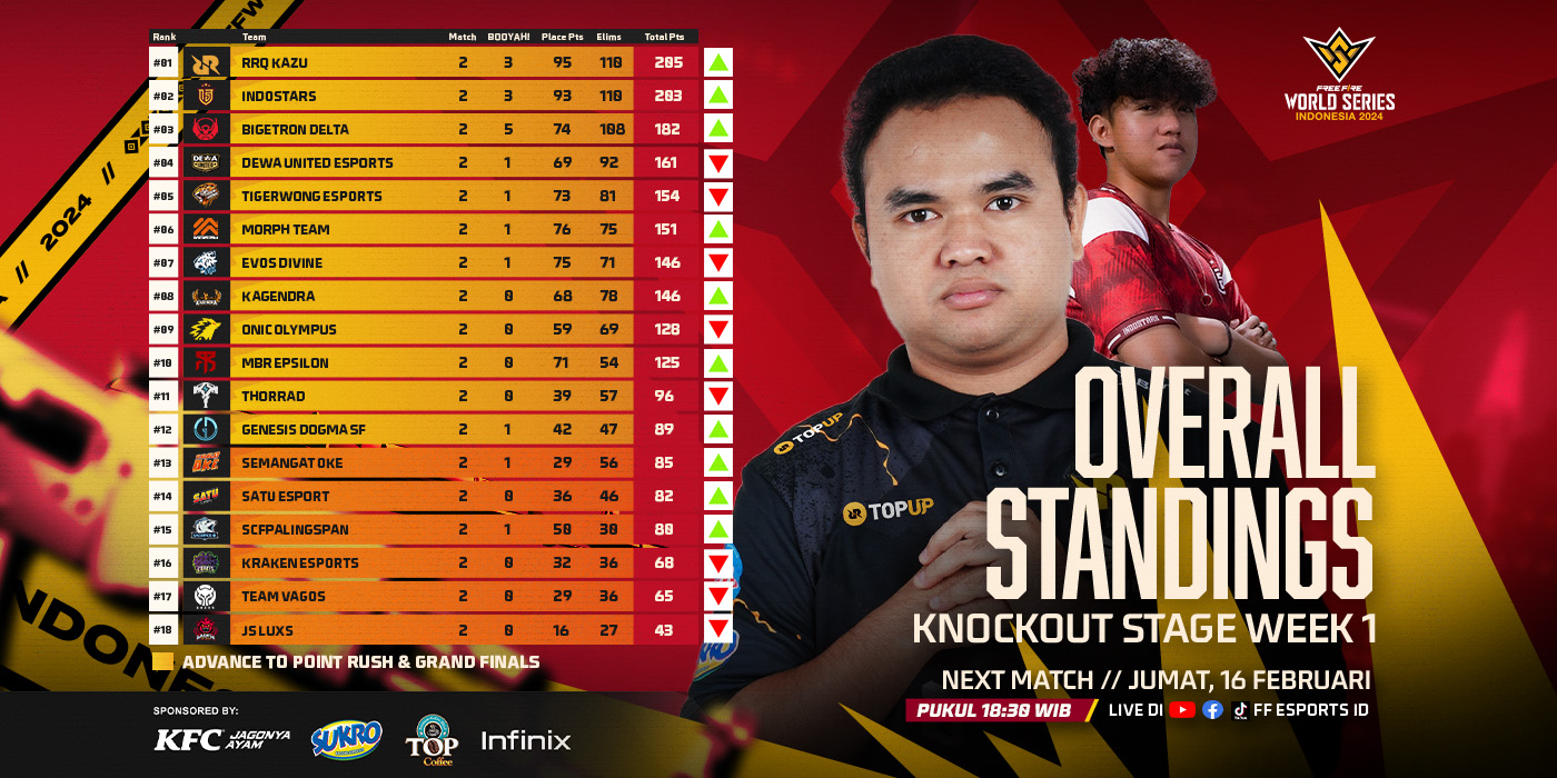 Di turnamen FFWS ID 2024 Spring ini hanya 12 tim teratas dari babak Knockout Stage yang akan melaju ke babak Final Phase. Artinya, akan ada 6 tim yang harus tersingkir di akhir pekan ketiga. Sejauh ini, 6 tim yang menghuni zona tidak aman ini hampir seluruhnya berasal dari tim komunitas, seperti Semangat Oke, Satu Esports, SCF Paling Span, Team Vagos, dan JS Luxs.