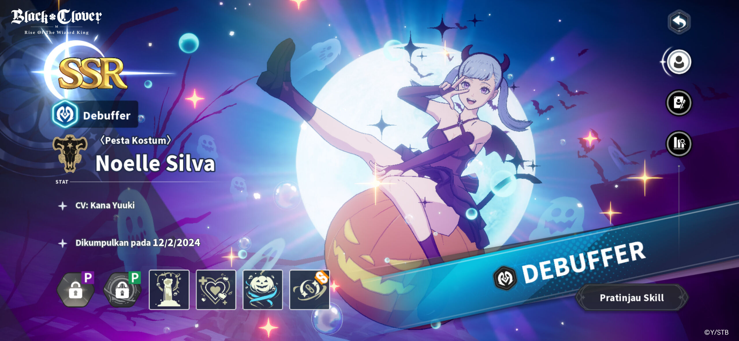 Karakter SSR <Pesta Kostum> Noelle adalah akan menjaid Debu er dengan Skill I [Water Prank] yang mampu mengurangi SP satu musuh, dan Skill II [Little Devil’s Prank] untuk mengurangi SP semua musuh. Dengan skill spesial [Trick Water], Noelle juga bisa memanggil tetesan air raksasa berbentuk labu yang akan menghilangkan efek bu dan mengurangi SP satu lawan.