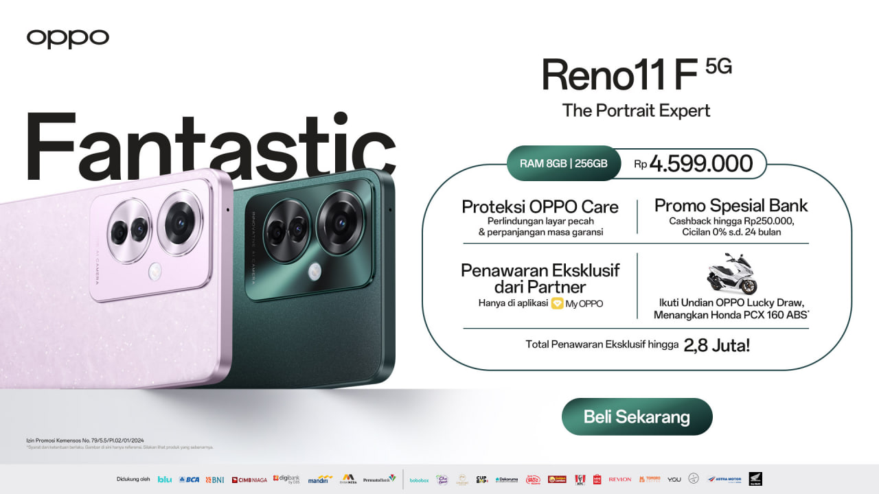 Khusus untuk konsumen yang menghadiri acara penjualan perdana Reno11 F 5G di OPPO Gallery Gandaria City Jakarta, OPPO Experience Store AEON Mall Jakarta Garden City, dan OPPO Experience Store Delipark Mall Medan pada 24 Februari 2024 akan mendapatkan keuntungan tambahan senilai Rp400.000 termasuk bonus 1000 Poin dari My OPPO.