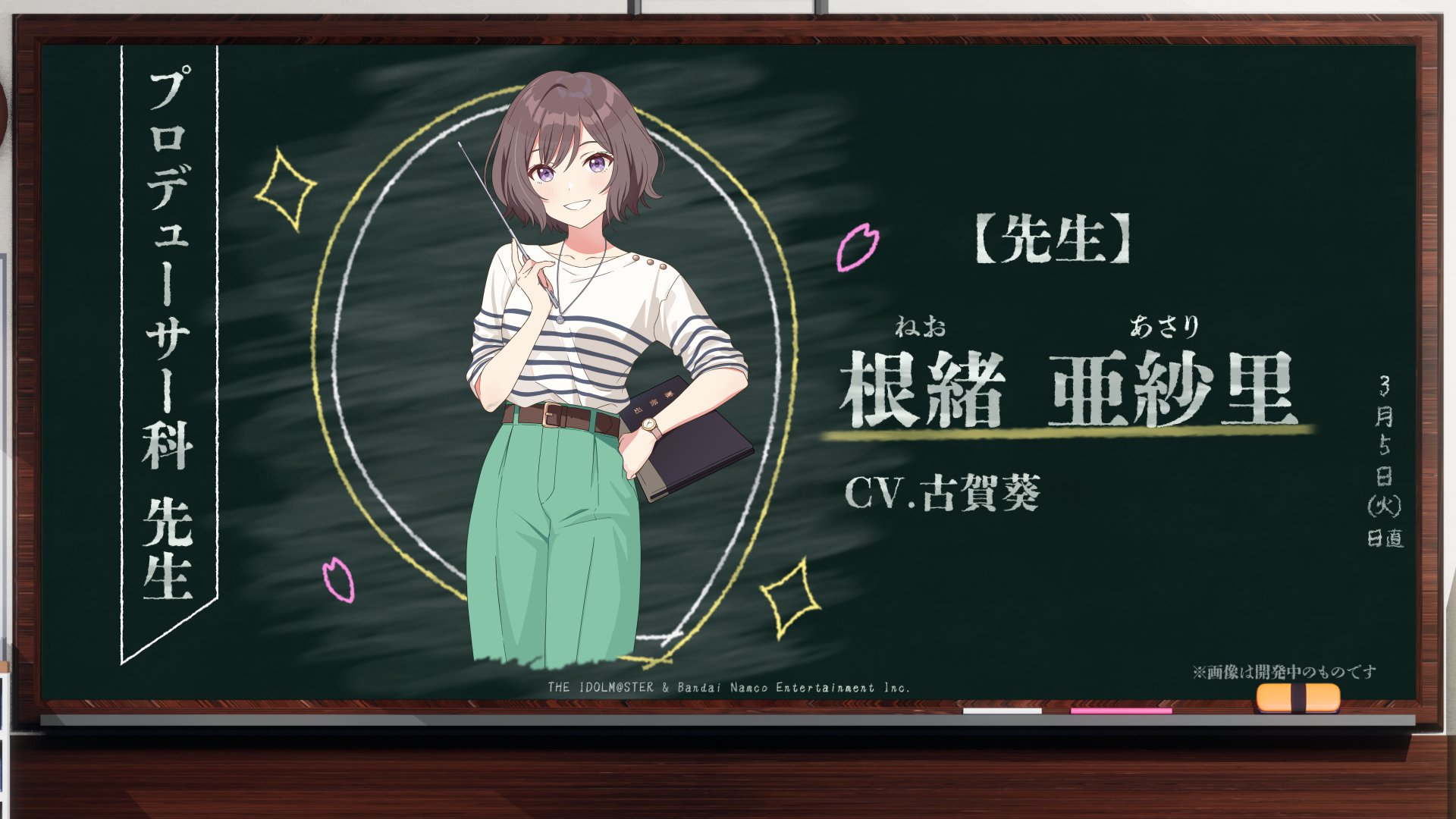 Selain karakter idol di gamenya, ada juga sang kepala sekolah, Kunio Juuou (CV. Akio Ootsuka) dan Asari Neo (CV. Aoi Koga), seorang guru dari departemen produser.