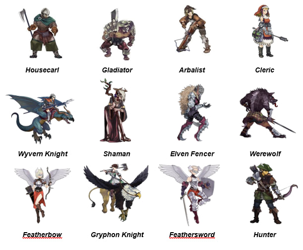Housecarl, Gladiator, Arbalist, Cleric, Wyvern Knight, Shaman, Elven Fencer, Werewolf, Featherbow, Gryphon Knight, Feathersword, dan Hunter. - Interaksi dengan Karakter: